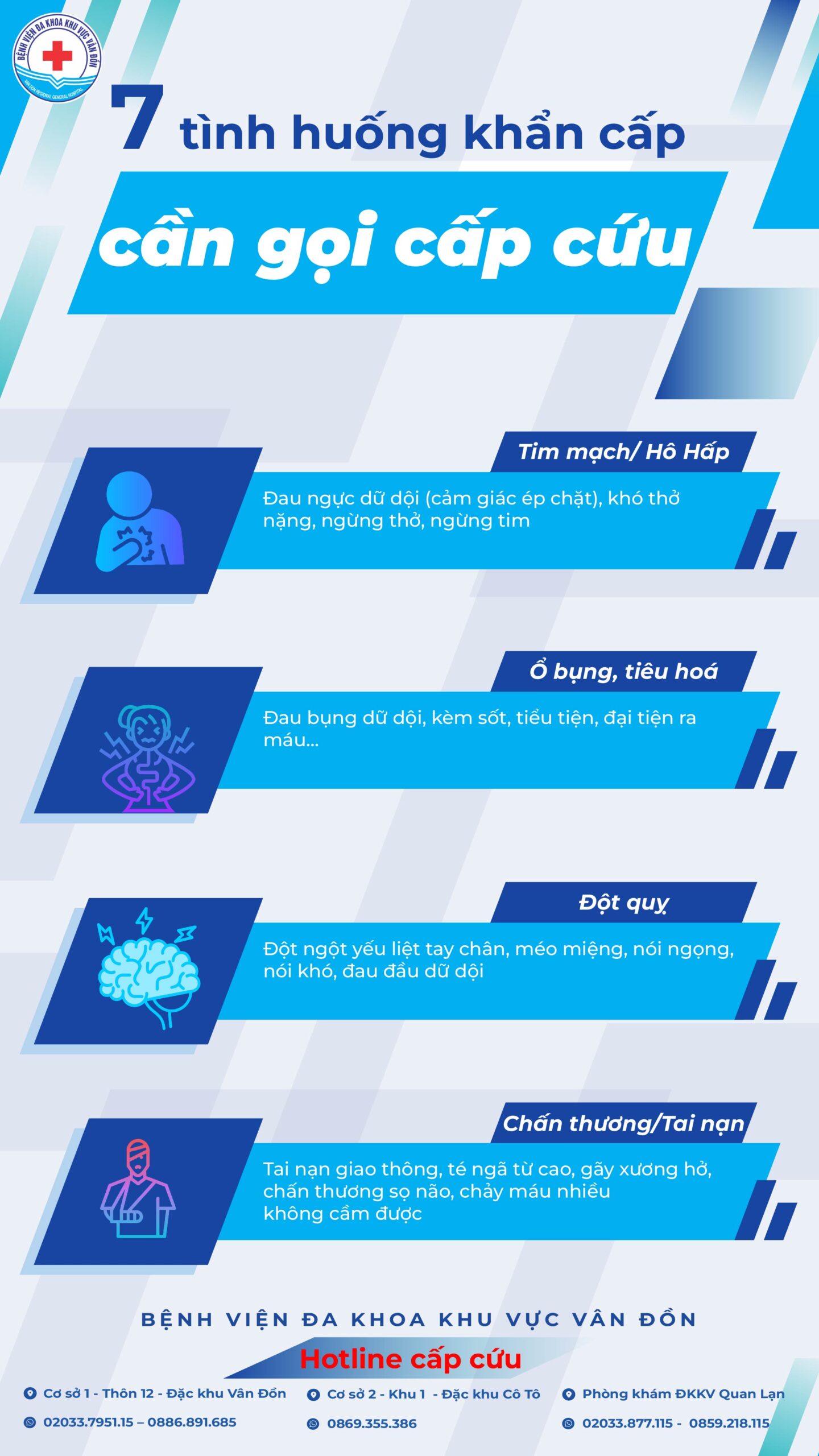🔴 Chấn thương – tai nạn: Tai nạn giao thông, té ngã từ trên cao, gãy xương hở, chấn thương sọ não, chảy máu nhiều không cầm được.