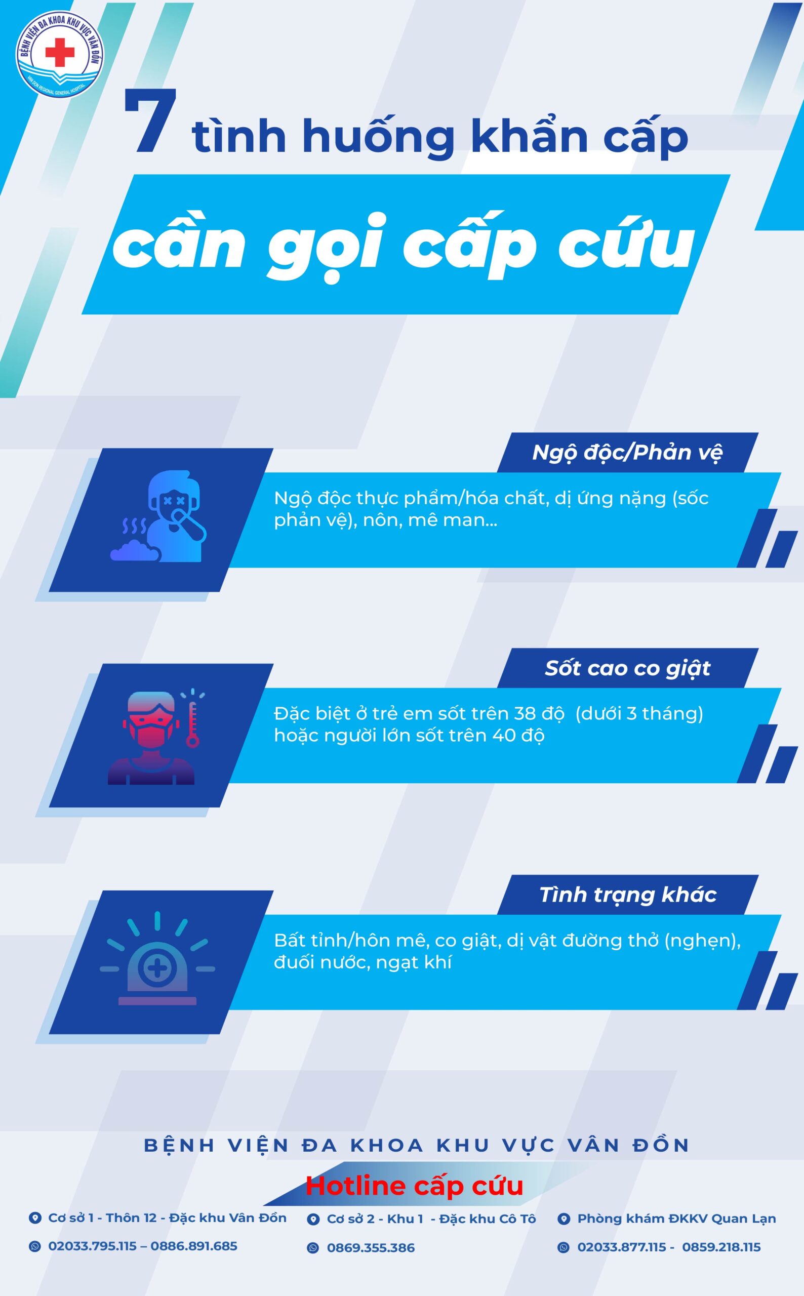 🔴 Tình trạng nguy cấp khác: Bất tỉnh/hôn mê, co giật, dị vật đường thở (nghẹn), đuối nước, ngạt khí.
