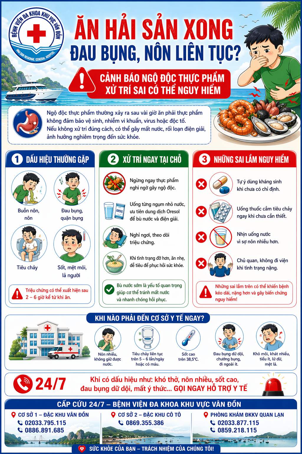 Chỉ sau một bữa ăn, đặc biệt là hải sản không đảm bảo, nhiều du khách đã rơi vào tình trạng nôn ói, tiêu chảy, đau bụng dữ dội. Tại Bệnh viện ĐKKV Vân Đồn, không ít trường hợp nhập viện trong tình trạng mất nước, kiệt sức do xử trí sai cách ngay từ những giờ đầu.