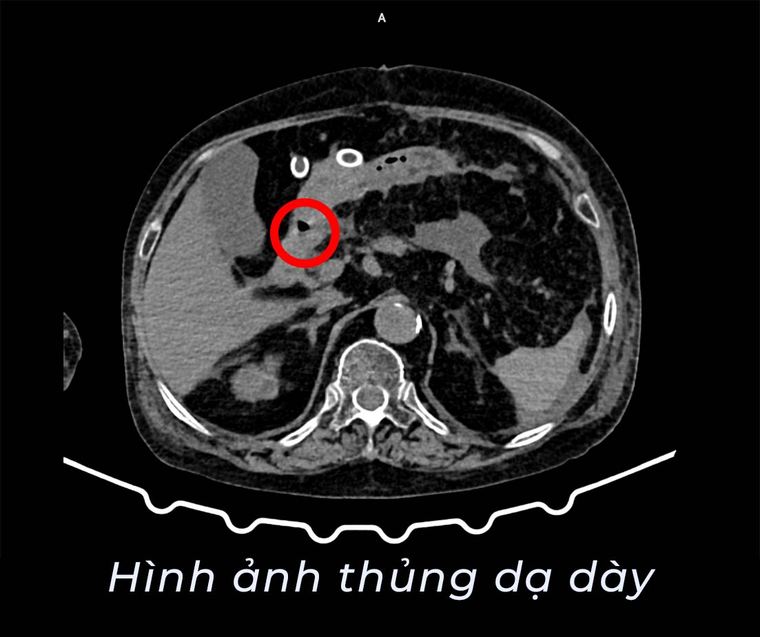 Nhận định đây có thể là tình trạng bệnh lý nguy hiểm trong ổ bụng, các bác sĩ đã nhanh chóng chỉ định chụp cắt lớp vi tính ổ bụng. Kết quả cho thấy hình ảnh khí tự do trong ổ bụng, kèm dịch ổ bụng, thâm nhiễm quanh dạ dày, đây là dấu hiệu điển hình gợi ý thủng tạng rỗng. Ngoài ra, các bác sĩ còn phát hiện bệnh nhân có nang gan trái, nang thận hai bên và sỏi thận hai bên.