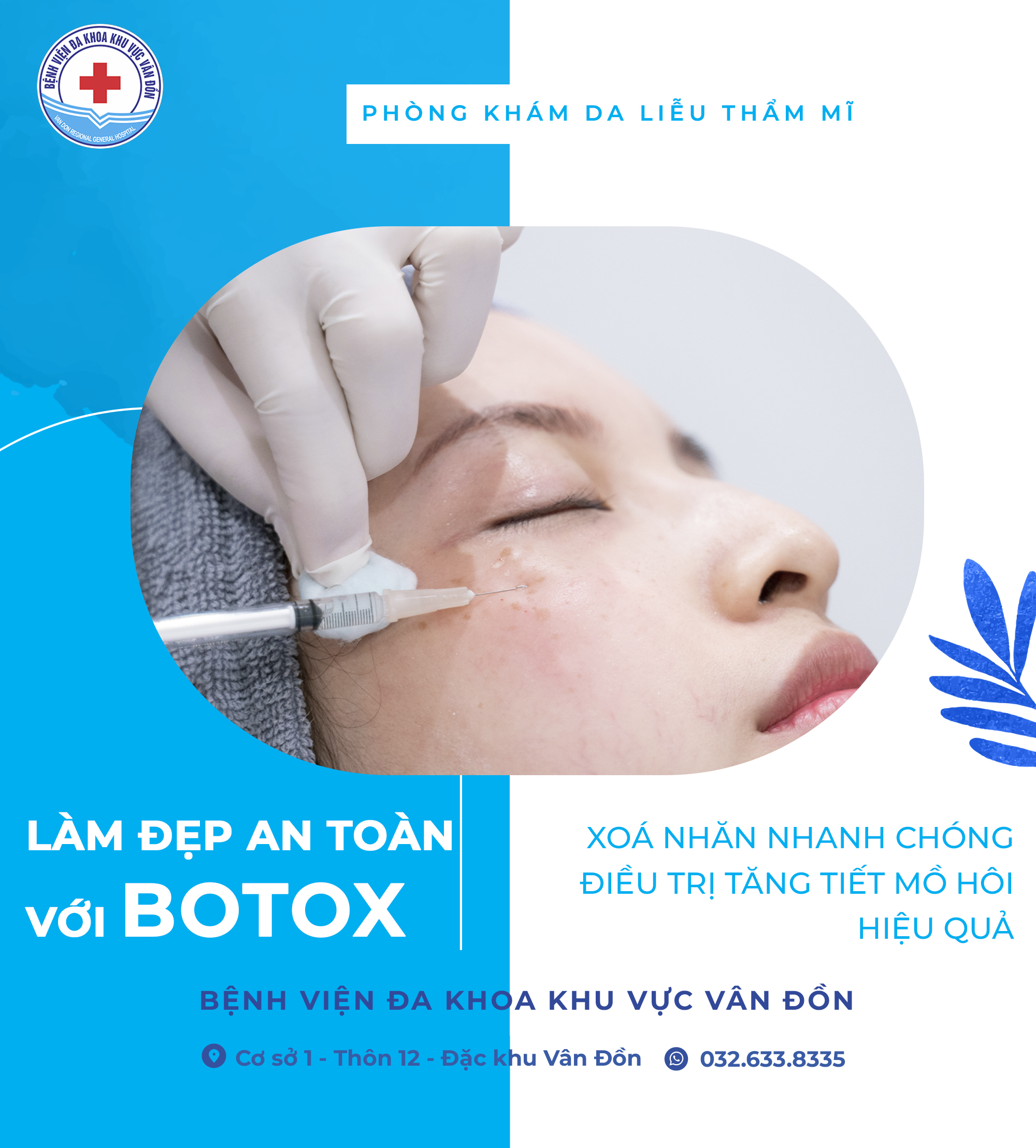 Với định hướng làm đẹp an toàn – chuẩn y khoa, Phòng khám Da liễu – Thẩm mỹ Bệnh viện ĐKKKV Vân Đồn là địa chỉ tin cậy cho những ai có nhu cầu tiêm Botox xoá nhăn và điều trị tăng tiết, mùi mồ hôi nách, giúp nâng cao chất lượng cuộc sống và sự tự tin mỗi ngày.