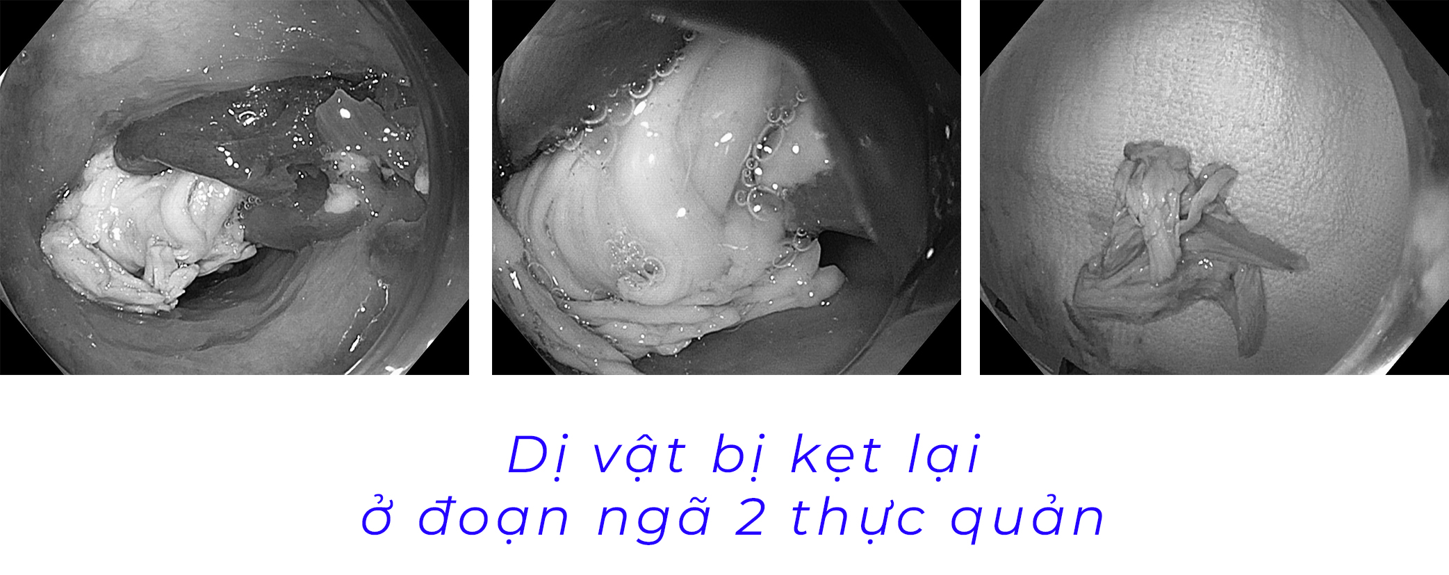 Ngay khi tiếp nhận, bệnh nhân được nội soi tai mũi họng, tuy nhiên không phát hiện bất thường. Trước triệu chứng nghi ngờ cao, các bác sĩ đã chỉ định nội soi thực quản bằng ống mềm để xác định nguyên nhân. Kết quả cho thấy tại vị trí ngã ba thực quản xuất hiện một khối dị vật kích thước khoảng 20mm, kèm nhiều thức ăn dạng rau xanh, gây chèn ép lòng thực quản, dẫn đến khó nuốt và khó thở.
