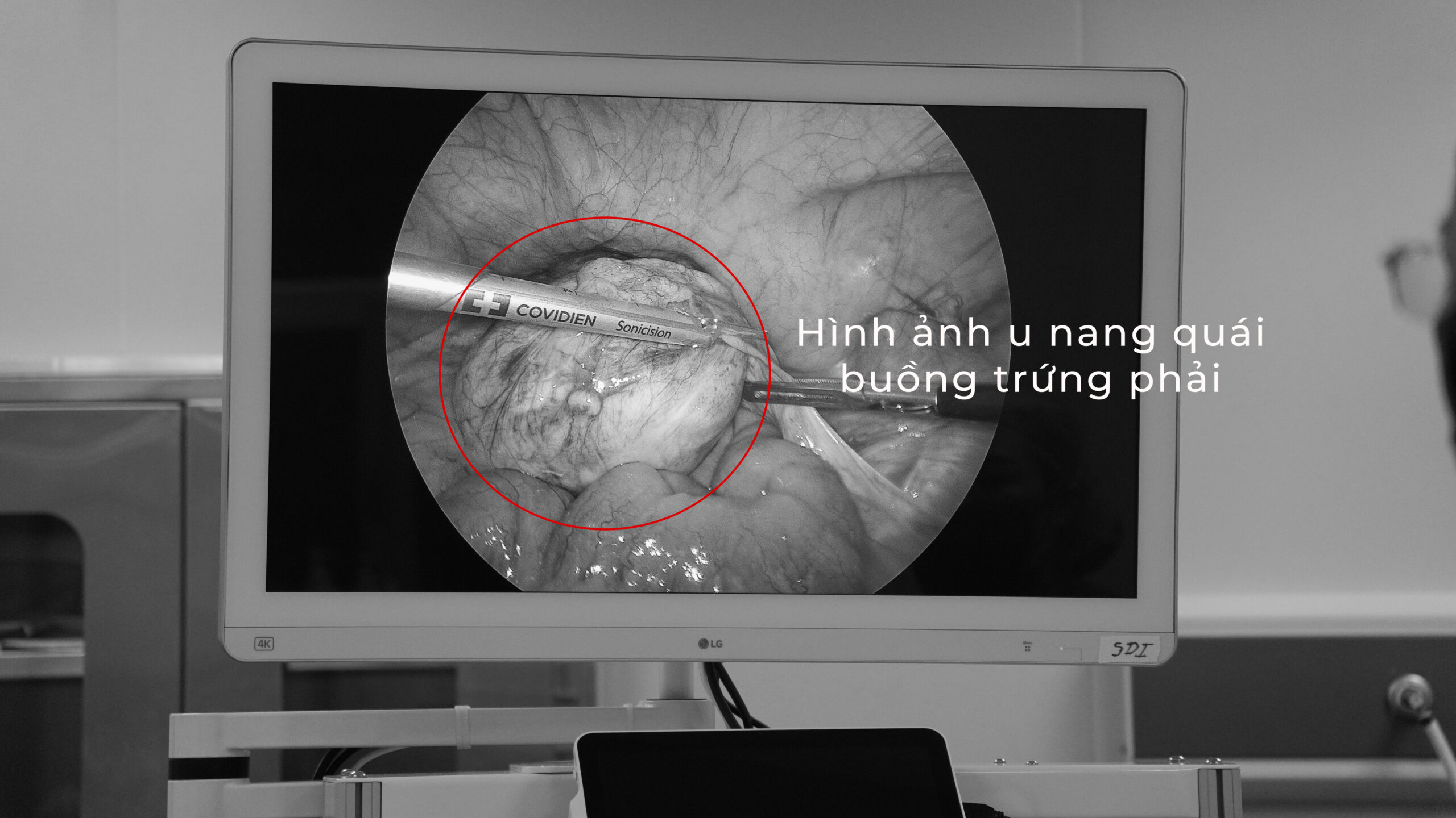 Trước khi nhập viện, bệnh nhân xuất hiện tình trạng đau bụng âm ỉ, kéo dài, ảnh hưởng đến sinh hoạt hằng ngày. Qua thăm khám và siêu âm, các bác sĩ phát hiện khối u nang buồng trứng phải kích thước 51×60 mm, cần can thiệp sớm để tránh nguy cơ chèn ép và biến chứng.