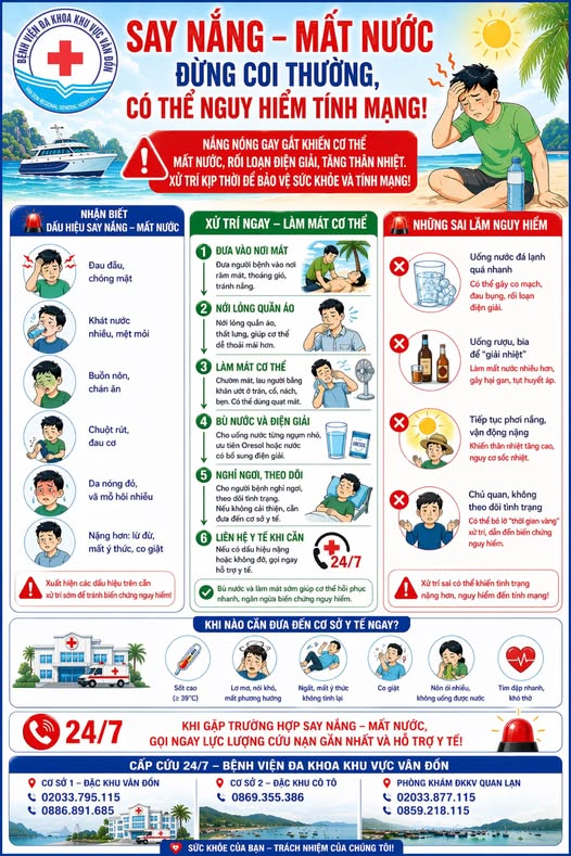Say nắng xảy ra khi cơ thể tiếp xúc với nhiệt độ cao trong thời gian dài, đặc biệt khi hoạt động ngoài trời, tắm biển hoặc di chuyển dưới nắng gắt. Khi đó, cơ thể không kịp điều hòa nhiệt, dẫn đến tình trạng mất nước, rối loạn điện giải và tăng thân nhiệt. Nếu không được xử trí kịp thời, tình trạng này có thể tiến triển thành sốc nhiệt, rất nguy hiểm.