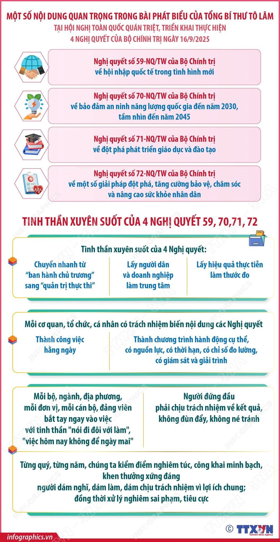 Ngày 16/9/2025, tại Hà Nội, Bộ Chính trị, Ban Bí thư tổ chức Hội nghị toàn quốc quán triệt, triển khai thực hiện 4 Nghị quyết của Bộ Chính trị về hội nhập quốc tế, an ninh năng lượng quốc gia, đột phát phát triển giáo dục và đào tạo và bảo vệ, chăm sóc, nâng cao sức khỏe nhân dân. Phát biểu và chỉ đạo tại Hội nghị, Tổng Bí thư Tô Lâm cho rằng: Tinh thần xuyên suốt của Nghị quyết 59 và Ba nghị quyết 70-71-72 là chuyển nhanh từ “ban hành chủ trương” sang “quản trị thực thi”, lấy người dân và doanh nghiệp làm trung tâm, lấy hiệu quả thực tiễn làm thước đo. Mỗi cơ quan, tổ chức, cá nhân có trách nhiệm biến nội dung các Nghị quyết thành công việc hằng ngày, thành chương trình hành động cụ thể, có nguồn lực, có thời hạn, có chỉ số đo lường, có giám sát và giải trình.